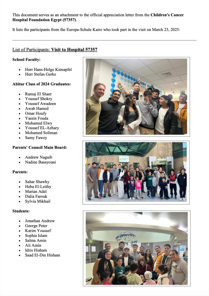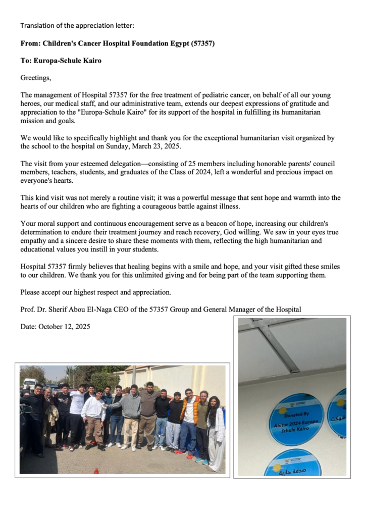 Die Europa Schule-Kairo erhielt ein offizielles Dankschreiben vom Children’s Cancer Hospital 57357 als Anerkennung für ihre Unterstützung der Initiative „Qalb Ala Waraq“ (Herz auf Papier), die vom Abiturjahrgang 2024 ins Leben gerufen wurde.