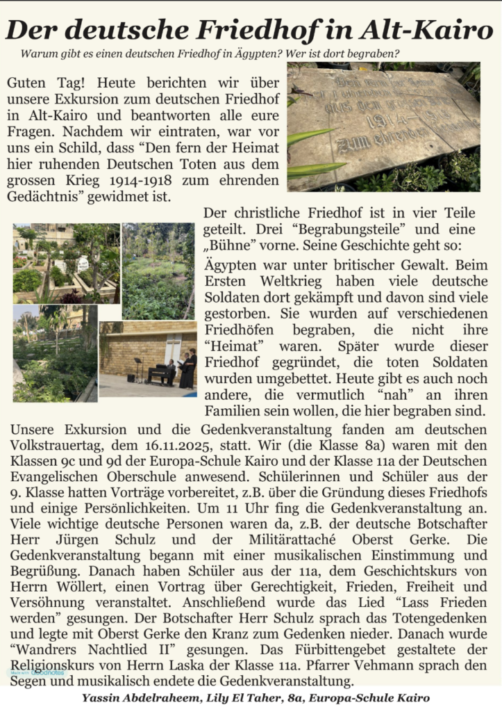 Der erste Teil führte zum deutschen Friedhof in Alt-Kairo, wo die Schülerinnen und Schüler an der Gedenkveranstaltung zum Volkstrauertag teilnahmen und wichtige Einblicke in Erinnerungskultur sowie historische Zusammenhänge erhielten.