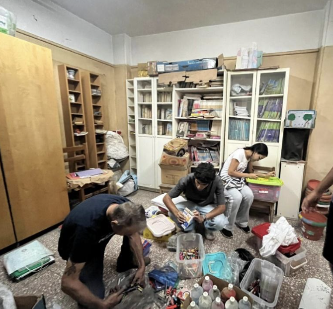 gesamten Materialraum sortiert und neu organisiert. Wir haben Stifte, Wasserfarben, Papier und